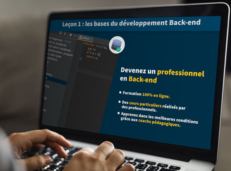 Nous proposons des cours particuliers, depuis votre domicile, 100% en ligne. Si vous débutez dans le domaine du développement back-end, inscrivez-vous à notre formation personnalisée afin de renforcer vos connaissances.